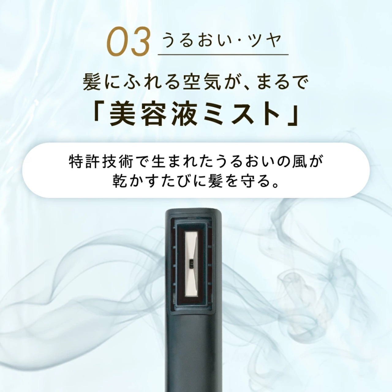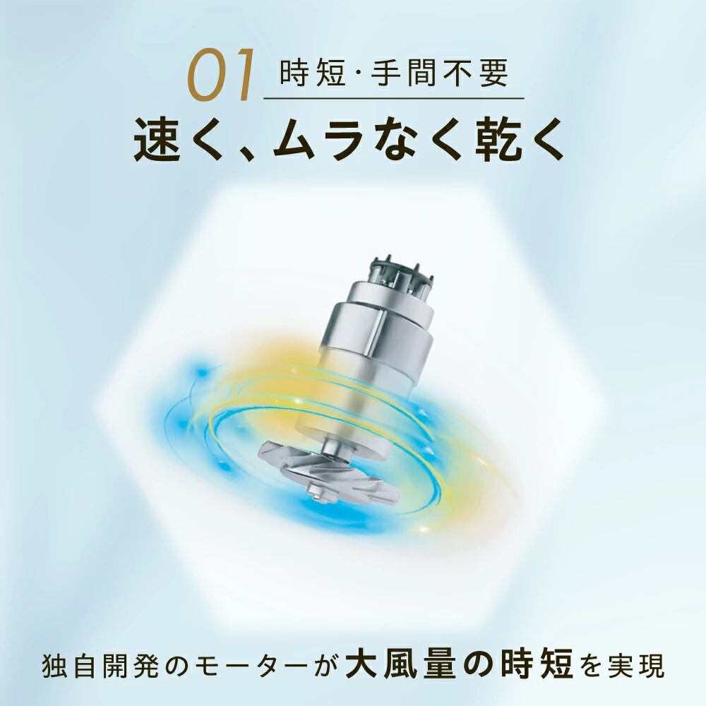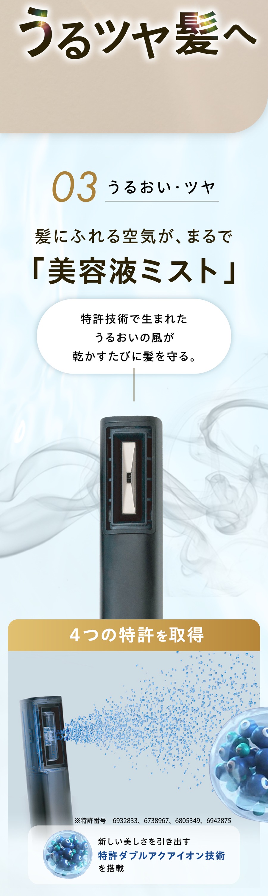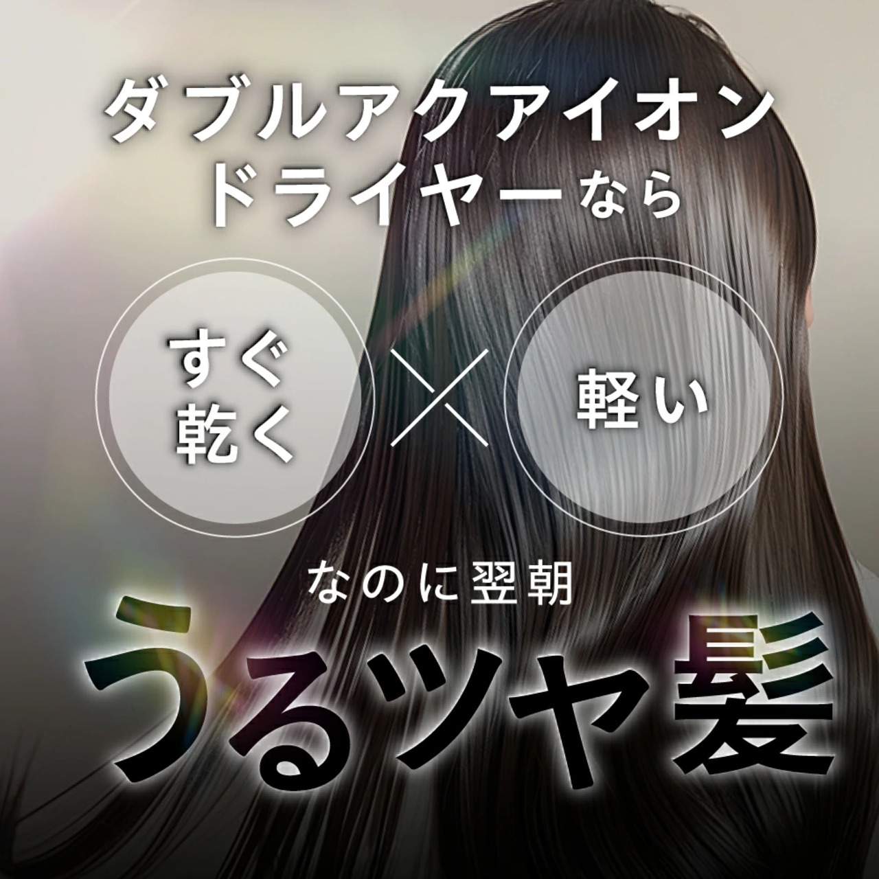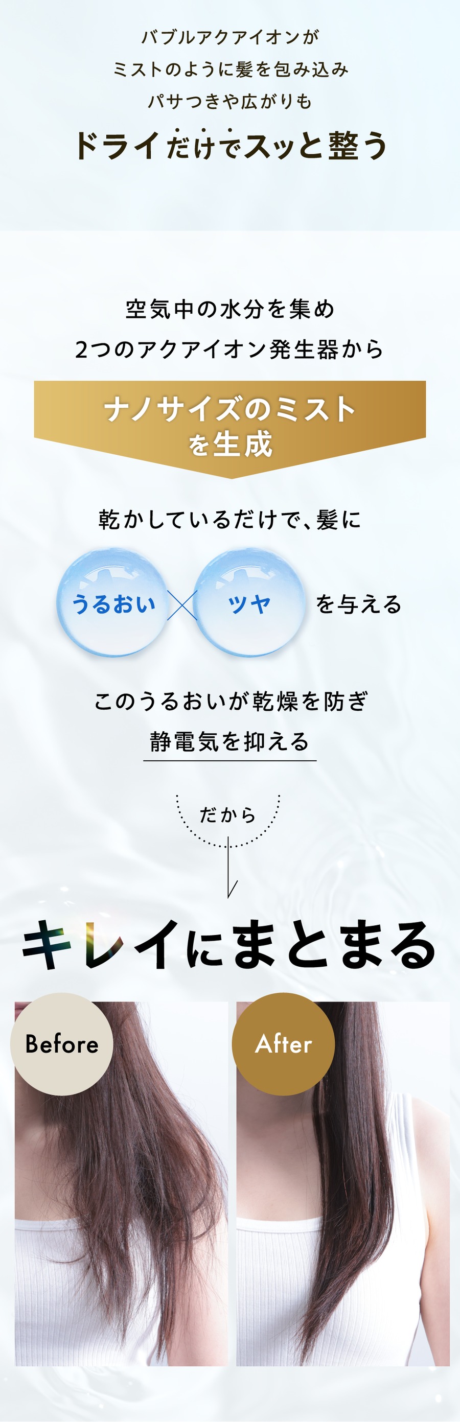 2つのアクアイオン発生器から同時に高電圧で水を霧化しナノサイズの微細なミストを生成する「ダブルアクアイオン技術」で、髪にうるおいを与え、健康的な輝きをサポート。シルクのようななめらかな髪質を実現します。
