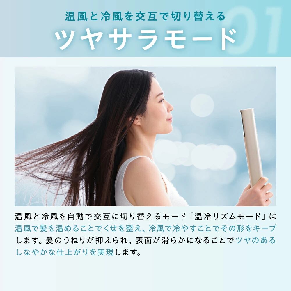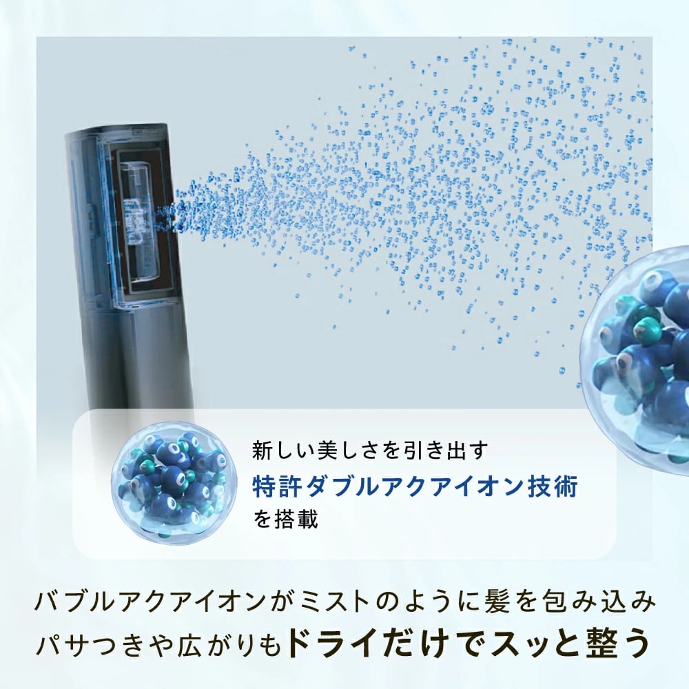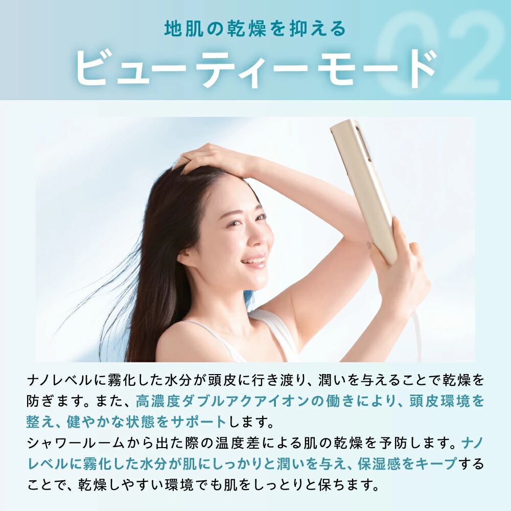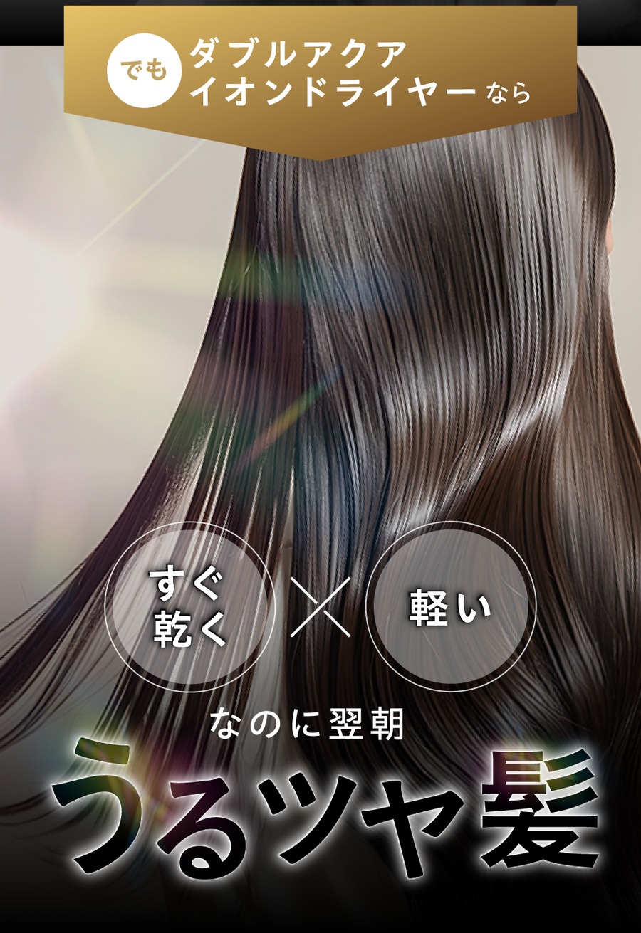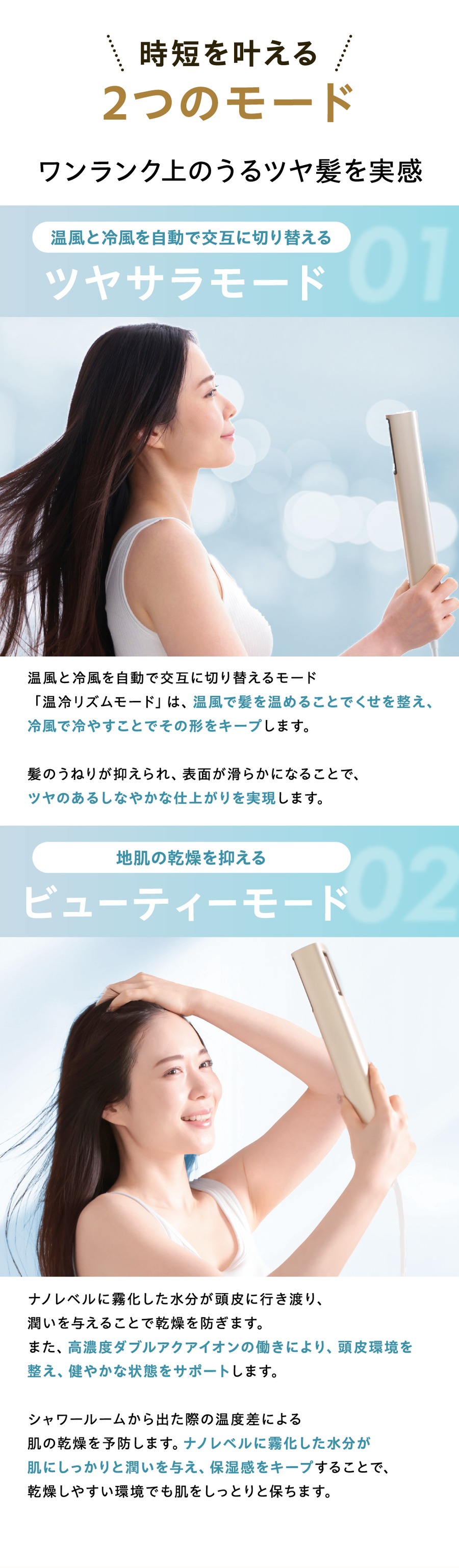 2つのアクアイオン発生器から同時に高電圧で水を霧化しナノサイズの微細なミストを生成する「ダブルアクアイオン技術」で、髪にうるおいを与え、健康的な輝きをサポート。シルクのようななめらかな髪質を実現します。