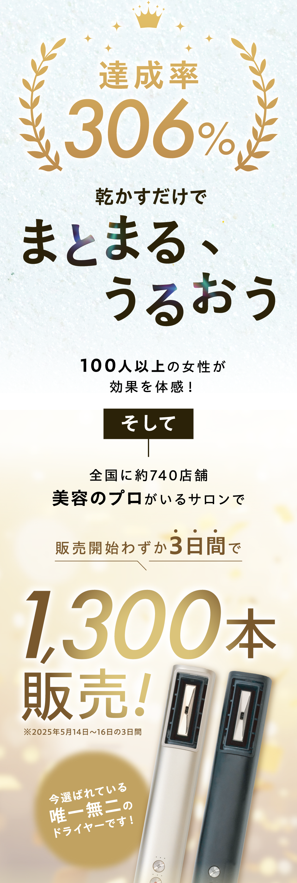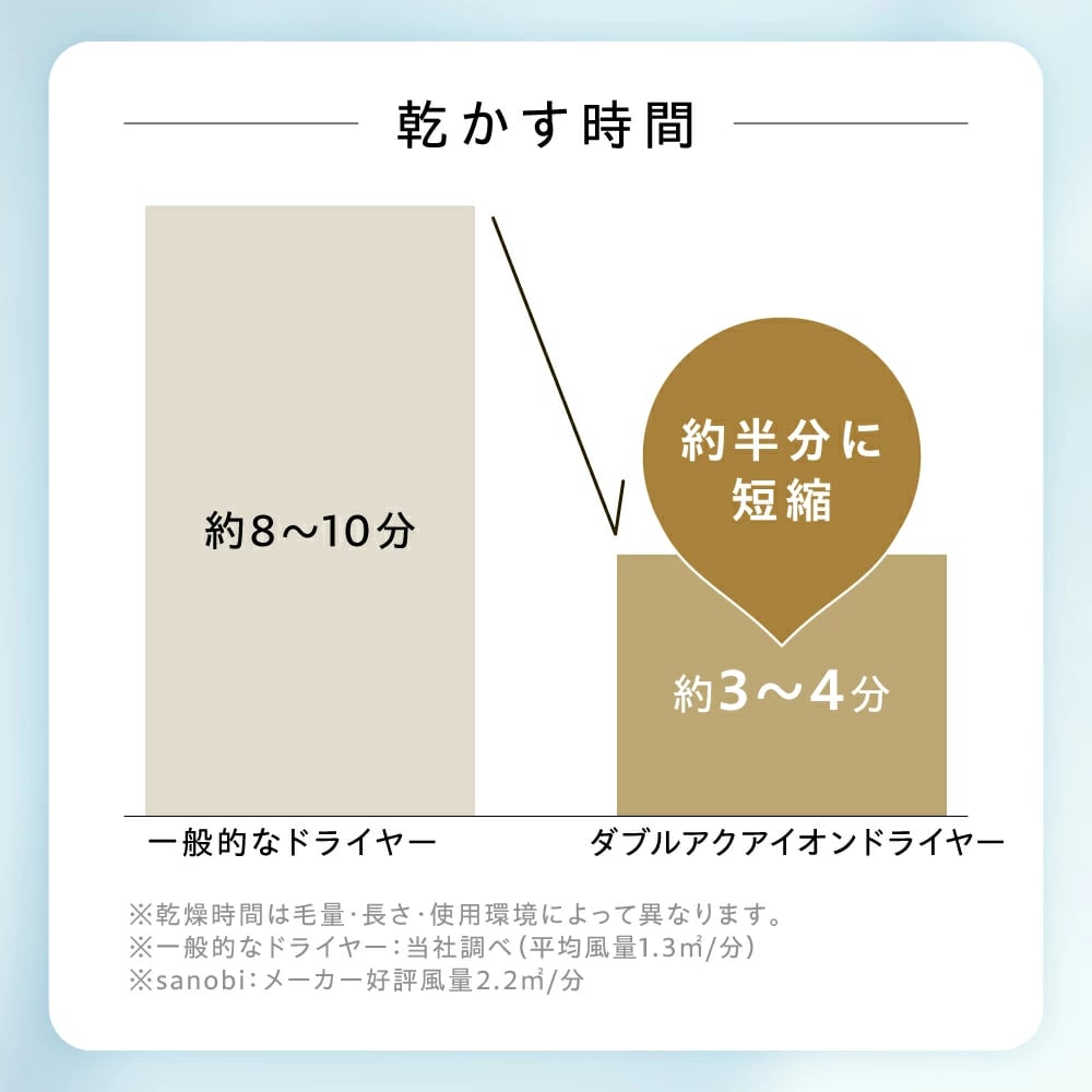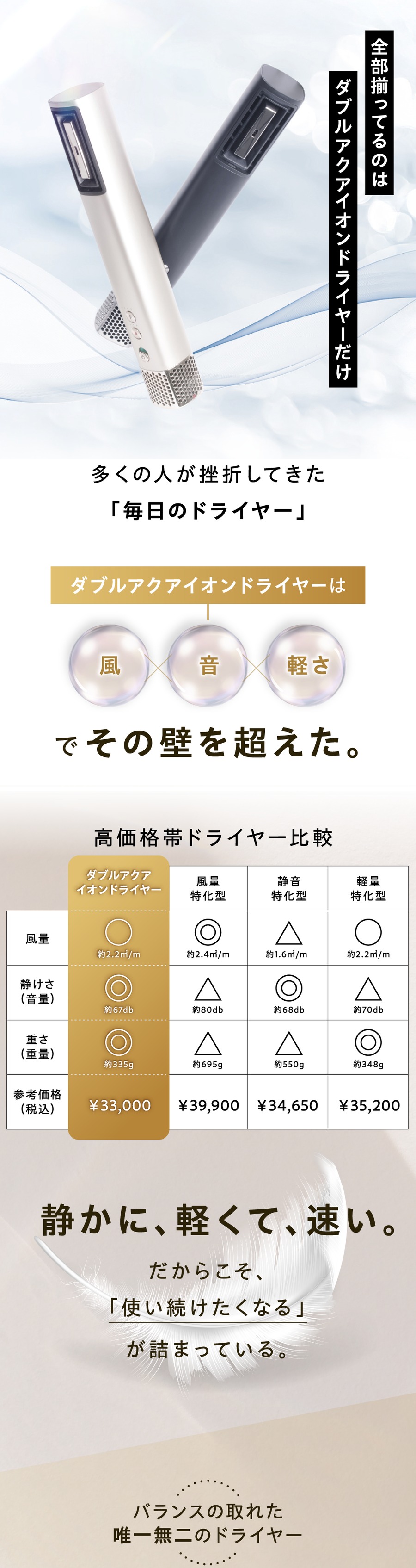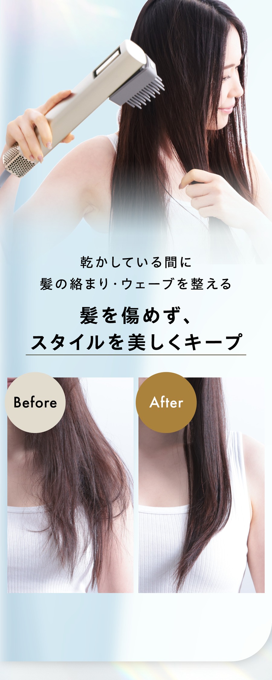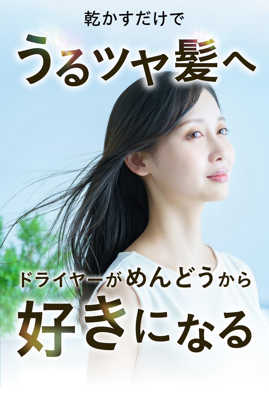 2つのアクアイオン発生器から同時に高電圧で水を霧化しナノサイズの微細なミストを生成する「ダブルアクアイオン技術」で、髪にうるおいを与え、健康的な輝きをサポート。シルクのようななめらかな髪質を実現します。