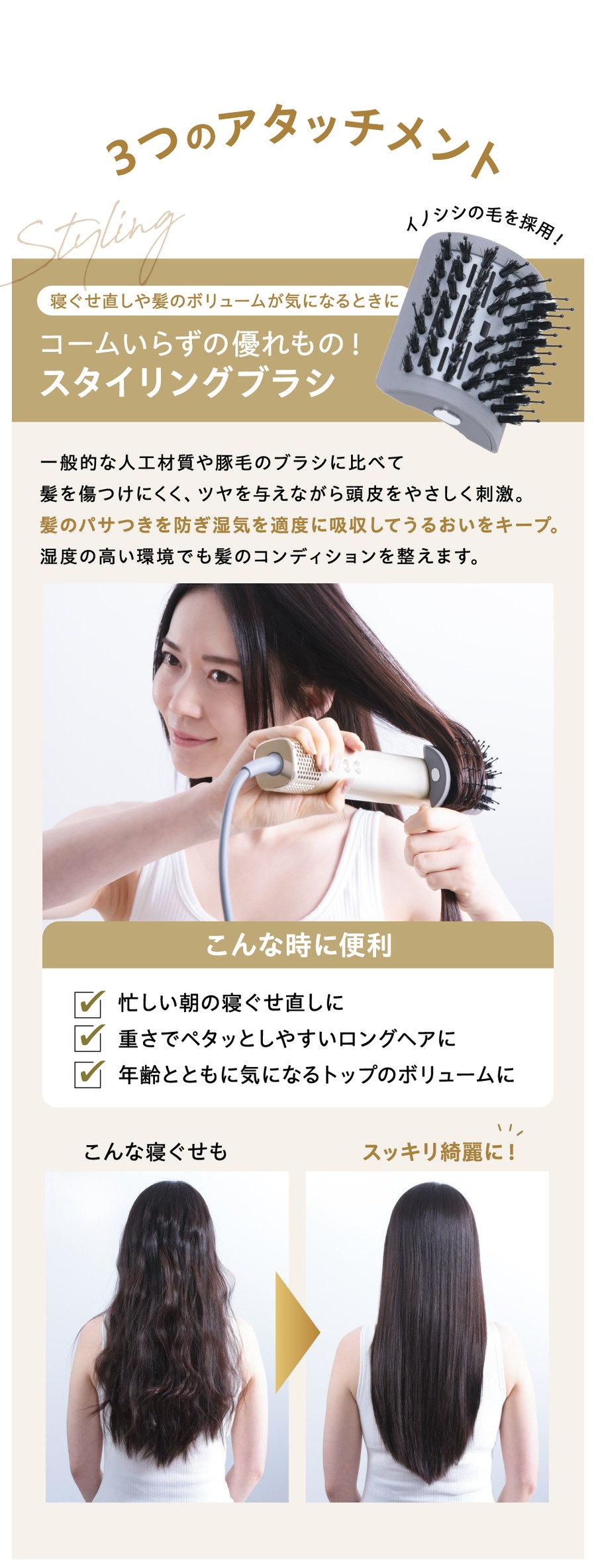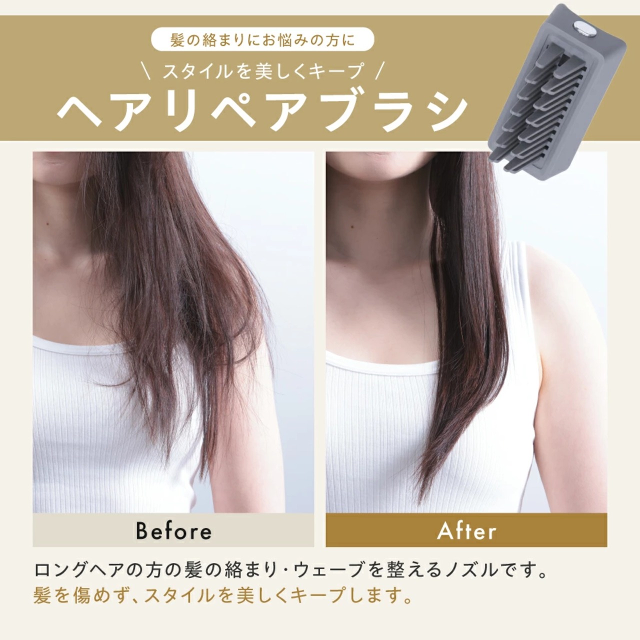 本体、速乾ノズル、リペアノズル、スタイリングブラシ(天然猪毛)、布収納袋、品質保証カード、取扱説明書