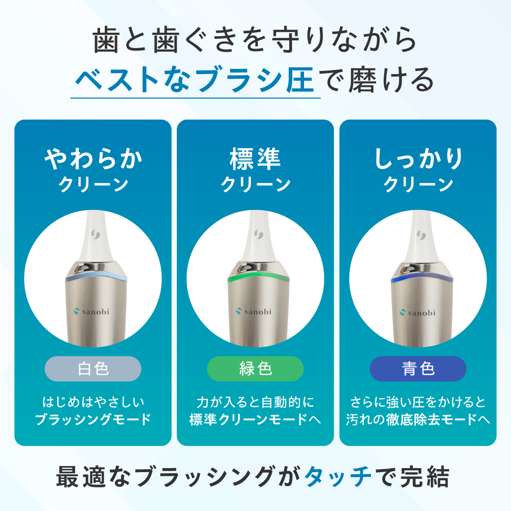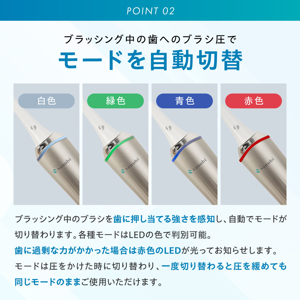 ブラッシング中のブラシを歯に押し当てる強さから、自動的にモードを切替※2。歯と歯ぐきを守りながら、“ベストなブラシ圧”で磨くことができます。