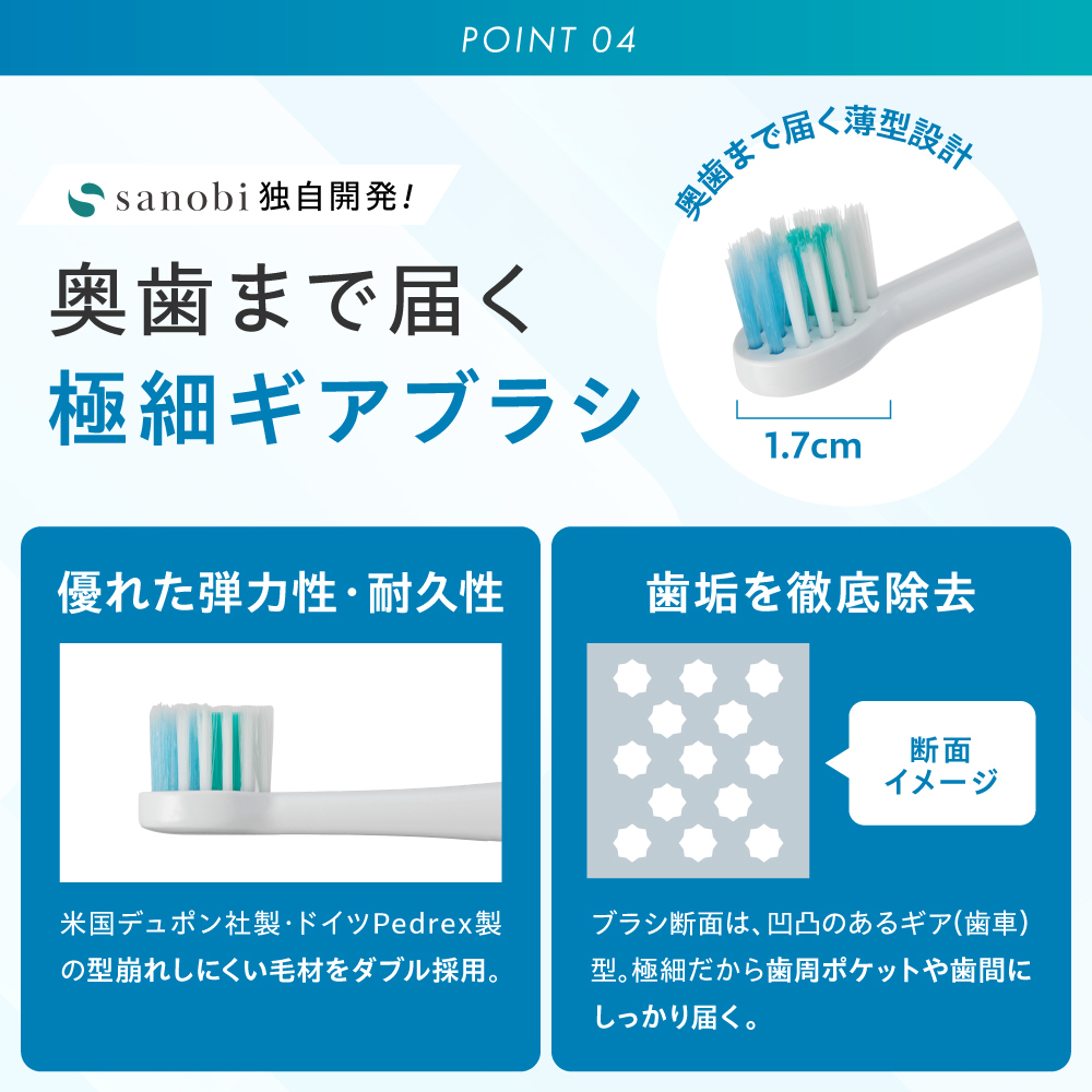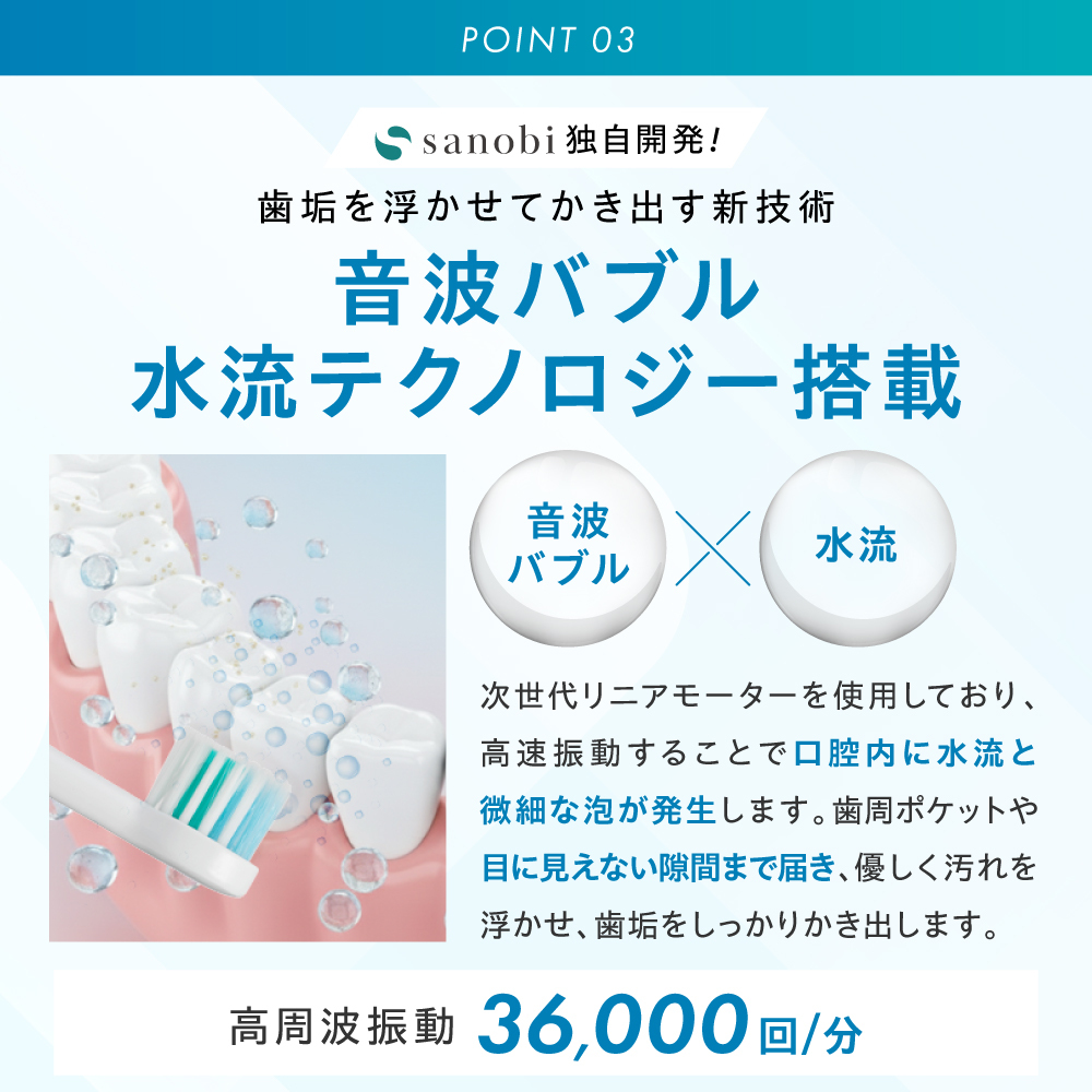 sanobi独自の「音波バブルテクノロジー」により、口腔内に水流と微細な泡が発生。歯周ポケットや目に見えないすき間にまで届き、やさしく汚れを浮かせ、歯垢をしっかりかき出します。