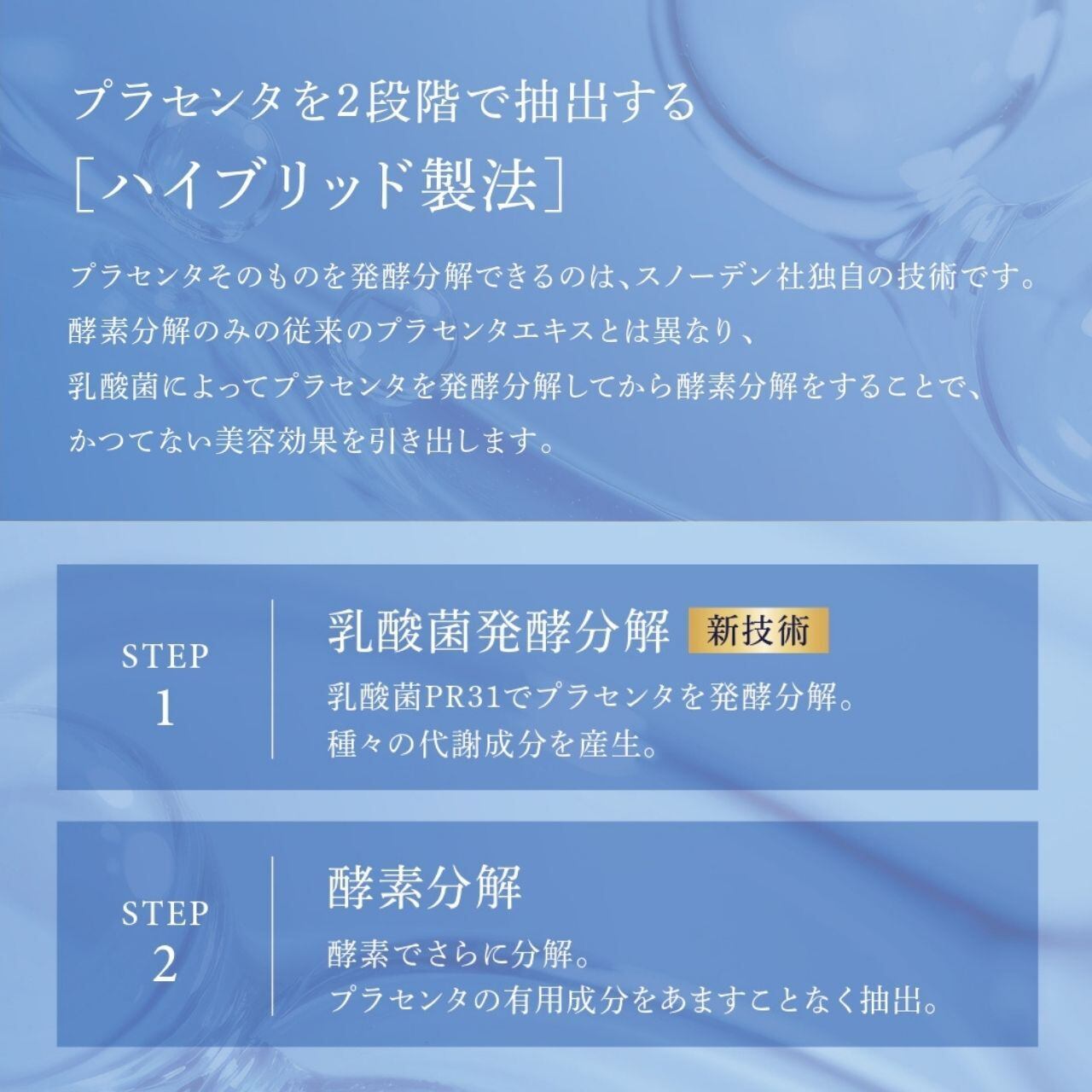 水、エンテロコッカスフェカリス/ブタプラセンタ発酵液、ダマスクバラ花水、エタノール、BG、プラセンタエキス、サイタイエキス、スーパーオキシドジスムターゼ、タモギタケエキス、ローヤルゼリーエキス、レモン果実エキス、加水分解エラスチン、加水分解コラーゲン、グリチルリチン酸2K、加水分解ヒアルロン酸、ユキノシタエキス、グルコシルヘスペリジン、エーテルワイス花/葉エキス、グリセリン、ブドウ液汁エキス、カニナバラ果実油、メチルパラベン、プロビルパラベン